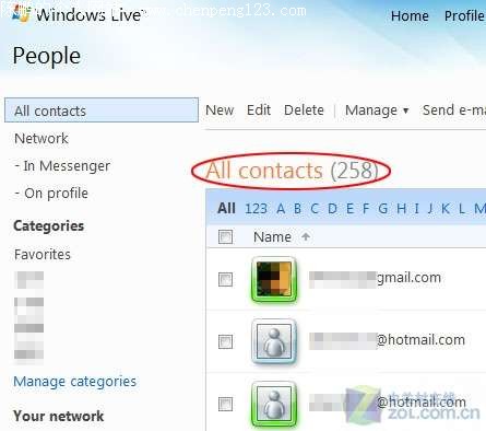 此外,细心的朋友肯定发现了,在“All contacts”下方,Hotmail以英文字母的方式为你的MSN联系人进行了排序,你可以在这其中方便、快捷的管理联系人。