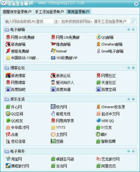 无忧登陆为用户提供了多种快捷灵活的登录帐户添加方式,包括“提醒保存登录帐户”、“手工添加登录帐户”和“常用登录帐户”。在“常用登录帐户”添加模式中,提供了广大网民常用的各种电子游戏、博客论坛和网站: