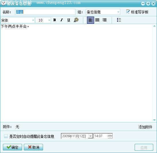 我们平时经常要记录一些日程安排信息和备忘信息。无忧登陆具有的备忘信息提醒功能,可以让我们很方便地设置备忘并提醒自己,显得极为方便和实用。它支持备忘信息内容的格式排版与字体编辑,允许添加一个附件,所有信息加密存储、安全可靠: