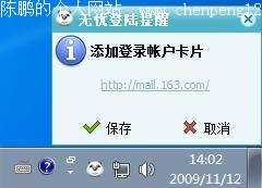 除了具有手动添加登录帐户的功能外,无忧登陆还能够智能提醒保存登录帐号信息。当我们在网页中输入帐号信息进行登录时,无忧登陆会弹出窗口提示保存当前登录帐号信息,这样以后我们就可以直接通过双击选项卡的方式快速登录: