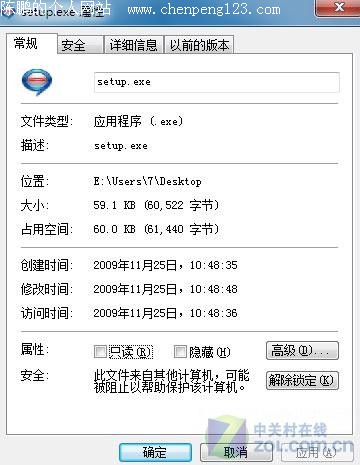 在这位网友的描述中,它一开始双击运行某程序的“setup.exe”文件时,鼠标指针在“转了几个圈”消失后,就没有了反应。然后,他就以兼容的方式运行程序,但软件依然没有反应,在他右键查看程序属性时,在属性窗口的最下方,它发现该程序被Windows 7锁定(如图1)。