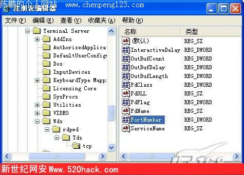 其次在该编辑界面的左侧显示区域,用鼠标展开HKEY_LOCAL_MACHINE注册表分支,从其后弹出的分支列表中依次选中SYSTEM\CurrentControlSet\Control\Terminal Server\Wds\rdpwd\Tds\tcp子键,在tcp子键所对应的右侧显示区域中,我们会看到一个名为PortNumber的子键(如图1所示),这个子键其实就是用来定义远程桌面端口号码的,将该子键的数值设置成其他端口号码,例如可以将其数值设置成“9999”;