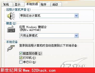 首先在本地工作站系统桌面中依次单击“开始”/“程序”/“远程桌面连接”命令,打开远程桌面连接程序界面,单击该界面中的“选项”按钮,并在其后弹出的选项设置窗口,单击“本地资源”标签,打开如图3所示的标签设置页面,选中其中的“磁盘驱动器”项目,再单击“连接”按钮,开始进行远程桌面连接;