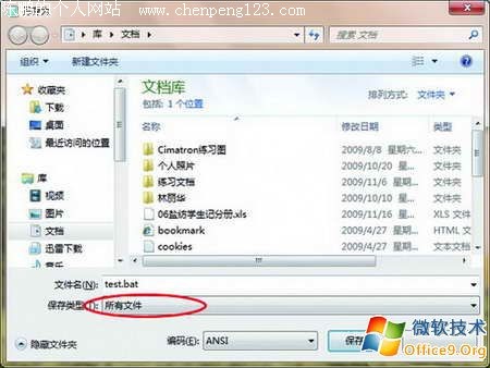 代码输入完成之后,将其保存为BAT格式的批处理文件(如图1),注意保存时请将文件类型设置为“所有文件(*.*)”,然后手工设置“.bat”的扩展名,否则仍然会被保存为TXT格式的文本文件。