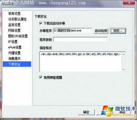 单击“浏览”按钮指定刚才转换而来的*.exe文件所在的路径(如图3),注意务必勾寻下载后自动杀毒”复选框。如果你并不希望所有格式的下载文件在下载完成之后都自动退出迅雷程序,那么可以在“指定格式”后面的文本框中重新指定相应的文件类型,最后单击“确定”按钮退出配置面板。