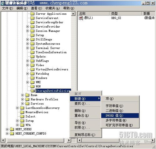 如下图所示,在新建的StorageDevicePolicies下选择新建一个DWORD值,DWORD值的名称为WriteProtect。
