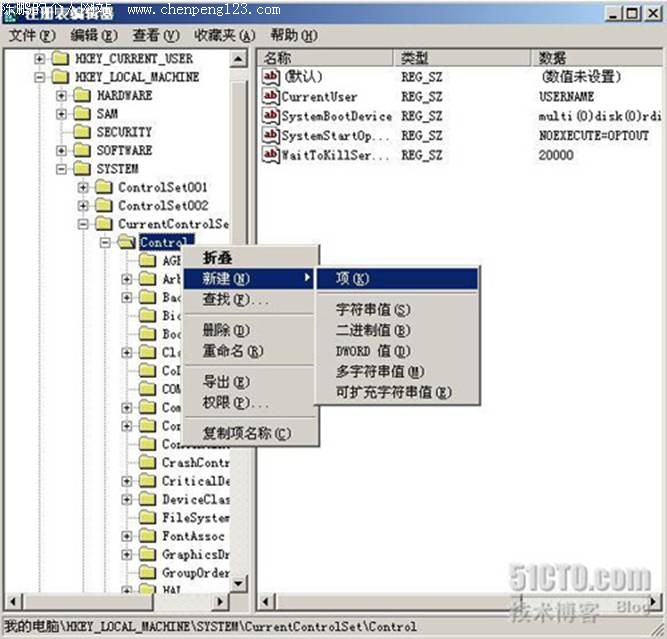 我们在一台XP SP2的计算机上来为大家演示如何实现只读U盘的制作,在计算机上运行Regedit,如下图所示,我们在HKEY_LOCAL_MACHINE\SYSTEM\Current\ControlSet\Control下选择新建一项,项的名称为StorageDevicePolicies。