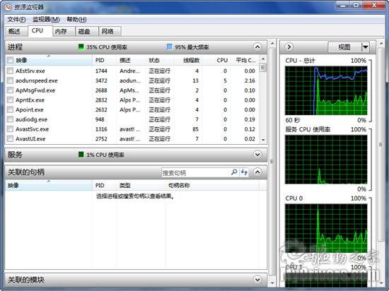 但是在Windows 7中,我们依稀的看到了sysinternals那强大身影,重点就是改进后的资源监视器,功能更加强大,使用也更加便捷。通过资源监视器,我们不仅可以直观的了解到系统中整体进程的情况,也可以方便的查看系统资源的占用情况。