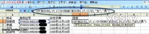 选中“性别”列的单元格,如D2。输入“=IF(MID(B2,17,1)/2=TRUNC(MID(B2,17,1)/2),"女","男")”(注意如上)后回车,该生“是男还是女”已经乖乖地判断出来了。拖动填充柄让其他学生的性别也自动输入。如图2。