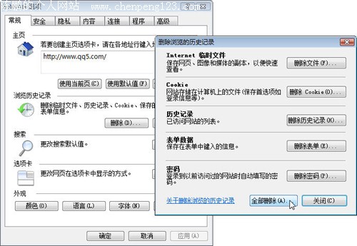 可以尝试在IE中选择“工具”→“Internet选项”命令,单击“常规”→“浏览历史记录”下的“删除”按钮,在打开窗口中单击“删除文件”和“删除Cookie”按钮,或干脆直接单击下方的“全部删除”按钮(如图2),然后再尝试重新下载资源一次。