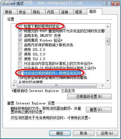 有时IE浏览器的设置也可能会影响到99%下载问题,可以先从浏览器自身设置原因下手。打开IE浏览器,选择“工具”→“Internet选项”命令,单击“高级”标签,之后取消“检查下载的程序的签名”复选框,同时确认选中“允许运行或安装软件,即使签名无效”复选框(如图1)。