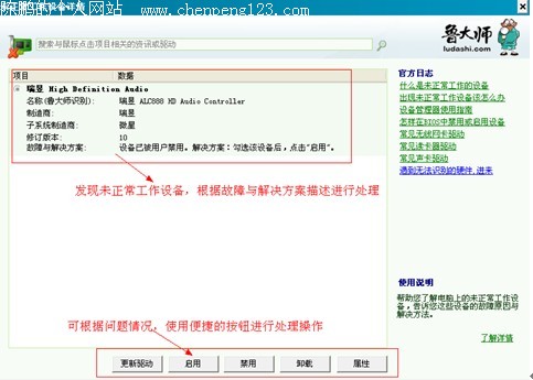 笔者所使用的软件版本是鲁大师V2.47,已经是发布的最新版本。因此没有必要进行升级。各位注意图3红色框选区域,可以清楚发现鲁大师已经检测到电脑有一个没有正常工作的设备,点击右边“查看详情”按钮,进入未正常工作设备详情界面,如图4所示,详细地记载未正常工作设备的情况,诊断出故障并给出解决方案。从图中可以看出,电脑问题出在声卡被禁用,解决办法为“勾选设备”点击启用,因此,只需要在界面下边五个按钮中点击“启用”按钮即可。