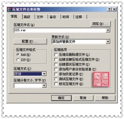 第二步:在弹出的“压缩文件名和参数”对话框的“压缩文件名”中输入文件名,在“压缩方式”中选择“存储”,单击“确定”按钮之后生成一个.RAR压缩文件(如图1)。