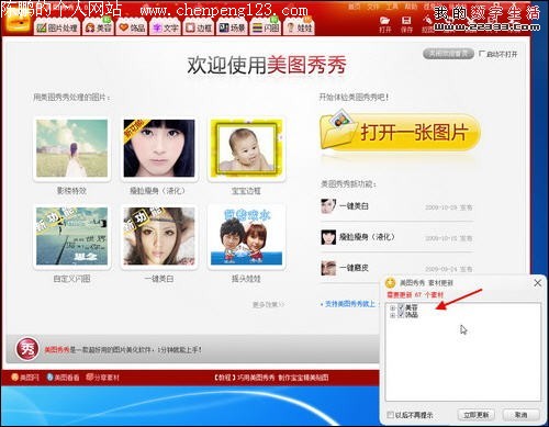 在Windows7系统下初次安装美图秀秀、或是更新安装了新版本的用户都知道,启动软件时会自动更新效果素材,如图1所示。但默认情况下系统可能会对这种外网访问实施防火墙控制,可避免遭受病毒如侵,可事实上我们用的是一个安全软件。所以就有必要适当调整下Windows7防火墙的设置,让它“放行”美图秀秀的素材更新。