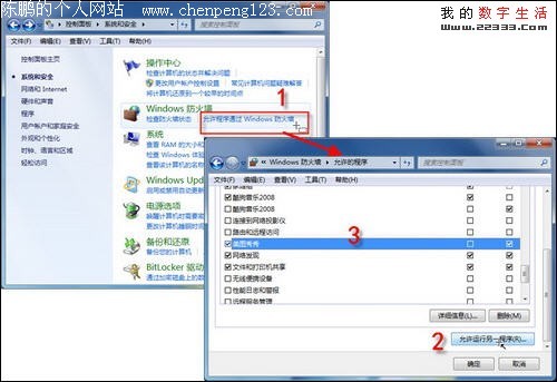 首先,进入控制面板的“系统和安全”项窗口,再其中单击“允许程序通过Windows防火墙”链接选项;在打开的“允许的程序”窗口下方,单击“允许运行另一程序”按钮,从安装目录找到美图秀秀主程序文件导入即可,如图2所示。这样就可以放心使用软件和在线更新素材库了。