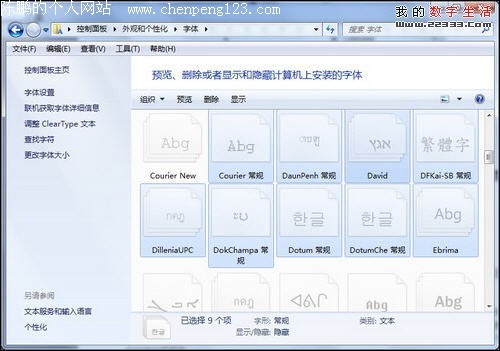 其次,删除多余的字体腾出一部分系统资源,也可有效提升Windows7的运行效率。从“控制面板”或系统安装目录中找到字体文件夹,将自己认为不常用的字体移动到非系统盘保存或直接删除即可,如图5所示。卸载的字体越多空闲出来的系统资源也就越多,Windows7系统整体性能当然就提高了。