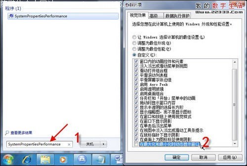 首先,我们可以关闭Windows7系统中窗口最大、最小化的动画效果,这样切换窗口就会流畅起来。方法是在Windows7开始菜单处键入“SystemPropertiesPerformance”并按下回车键;在打开的“性能选项”下方选项框中,取消“在最大化和最小化时动态显示窗口”的勾选状态再点确定即可,如图4所示。