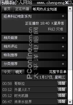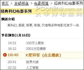打开PPStream的官方首页。依次点击分类“全部频道>电影频道>经典科幻电影系列”,此时你将看到“经典科幻电影系列”频道的节目预告(如图1)。