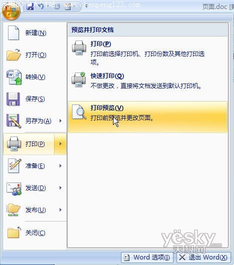 点击Office按钮,在弹出的菜单中选择“打印-打印预览”菜单命令,调出打印预览对话框。