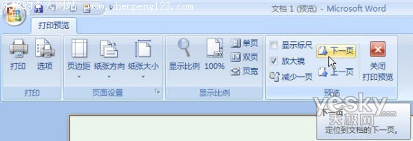 在“打印预览”界面中组中可以点击“下一页”和“上一页”按钮在不同的页面之间切换,在“显示比例”组中可以点击“单页”和“双页”按钮在预览时显示一页或者两页。