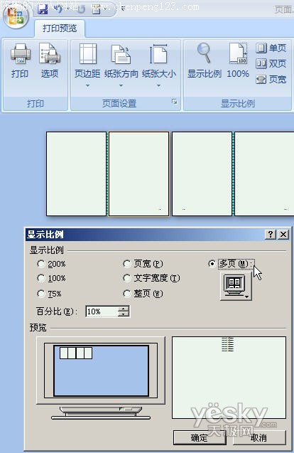 如果想要在预览时显示更多的页数,可以单击“显示比例”按钮,调出显示比例对话框。
