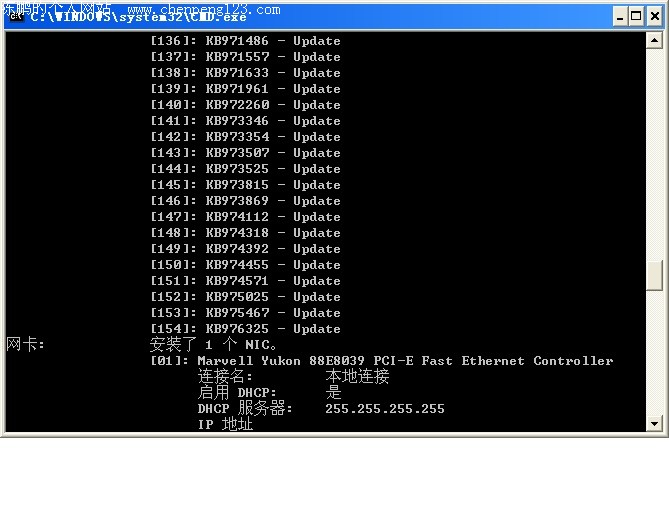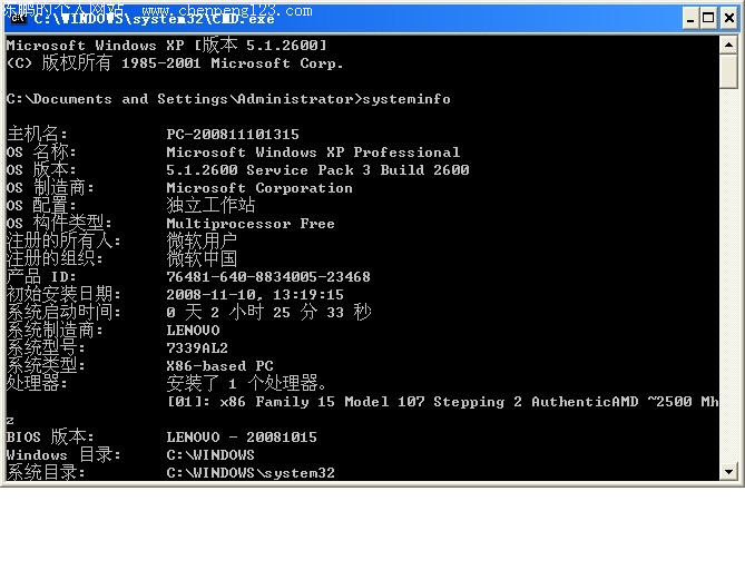 以XP系统来说,按“开始”-“运行”,输入“CMD”回车后,再在DOS窗口下输入“systeminfo”命令,就可在此看到系统的所有信息,如主机名、处理器、网卡、以及系统打了多少补丁等。