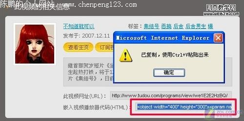 首先,在土豆网随便找到到你喜欢的一个视频,具体在这里就不介绍了。在视频播放的下方复制“嵌入视频播放器代码(HTML)”,之后回弹出一个对话框,提示已复制。
