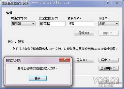 在“中文简繁转换”对话框中,单击“自定义词典”按钮。在“简体繁体自定义词典”对话框中,在“转换方向”下的框中选择“繁到简”,在“添加或修改”下的框中键入繁体词汇“部落格”,在“转换为”下的方框中键入简体词汇“博客”,在“词性”下的方框中选择“名词”,然后单击“修改”(或者该处是“添加”)按钮,再单击“确定”按钮(如图2),最后单击“关闭”按钮。