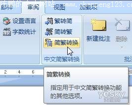 启动Word 2007,单击“审阅”选项卡,然后在“中文简繁转换”组中,单击“简繁转换”按钮(如图1)。