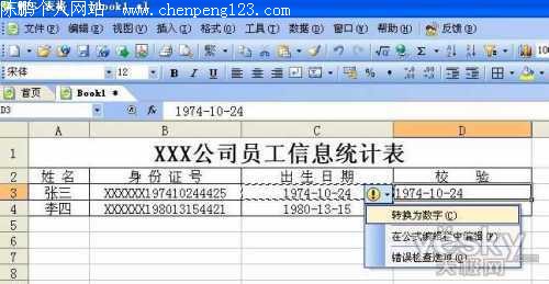 这样D列的数据就由文本格式转换成了真实的“日期”格式,细心的你就会发现只有正确的日期才能成功转换,其对齐方式为“右对齐”,而不正确的日期则仍是文本格式,对齐方式仍为“左对齐”(图4)。有了比较,大家一眼就能看出不正确的身份证号码,更正起来那是相当的容易了。