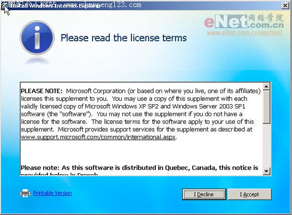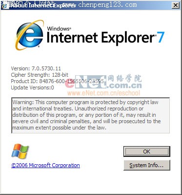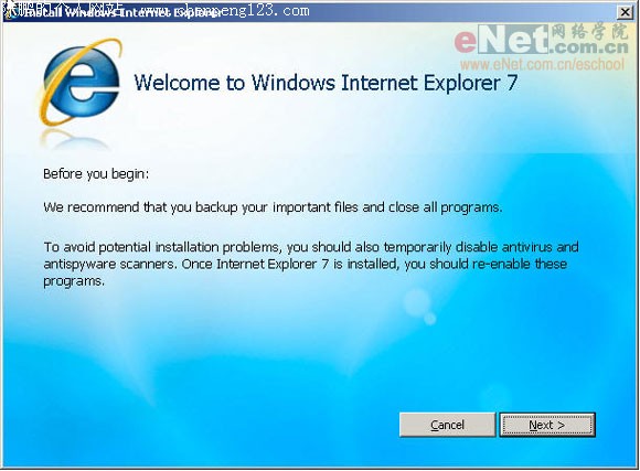 大名鼎鼎的微软正式推出了自己的新一代浏览器IE7.0。它集成了反钓鱼功能、多页面浏览等,是微软用来迎战Firefox的强有力武器。今天就带领大家去安装试用一下。 在过去的14个月中,微软对IE7进行了严格的测试,先后发布5个测试版本。与当前的IE6相比,IE7在功能方面有显著提升。如支持多标签浏览,内置反钓鱼功能等等。 据网络分析机构WebSideStory的数据显示,IE浏览器当前在美国的市场份额已经下滑至86%,而Firefox则增加到11%。两年前,IE的市场份额高达93%。 从本周三晚,用户可以免费下载IE7。下个月,微软将通过自动升级功能,为Windows XP用户升级。微软此前曾表示,IE7发布后,将继续提供IE6的技术支持。 请点击这里进行IE7英文版官方下载 下面是笔者的安装过程: 客户端大小为14.8M。
