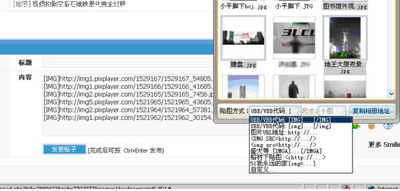 另外还有比较个人性化的功能,即是可以一次性发几张图片. 把选择好的照片直接拖到论坛的正文框中, 释放鼠标,正文框会出现如下图片代码,( 如图3所示。)
