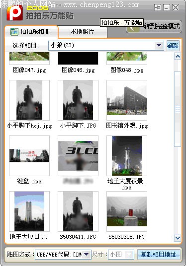 拍拍乐万能贴界面小巧而简洁,首先选择要贴的图片所在的相册,当中显示了选择相册中图片的缩略图后,而我们要做的仅仅是轻轻的拉动鼠标,把图片放到论坛或博客中的目标。这样就完成了