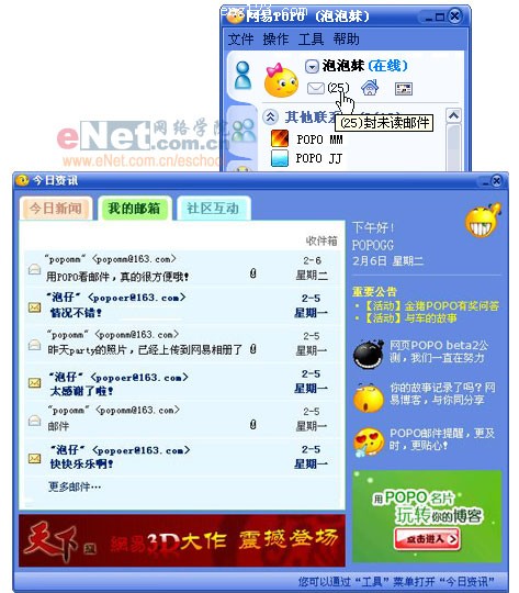 2007金猪年迈近,网易POPO迎来开门红,金猪版POPO隆重登场,同时网页POPO也结束了长达3个多月的公测阶段,在不断优化了性能与功能之后以正式版本的成熟身份亮相。 金猪版POPO的核心功能是实现了跨产品跨终端的互联,同时全面提升了邮件提醒服务,且看以下精彩亮点: 一、产品互通,POPO架起新桥梁