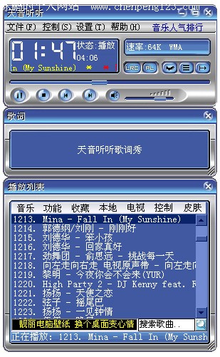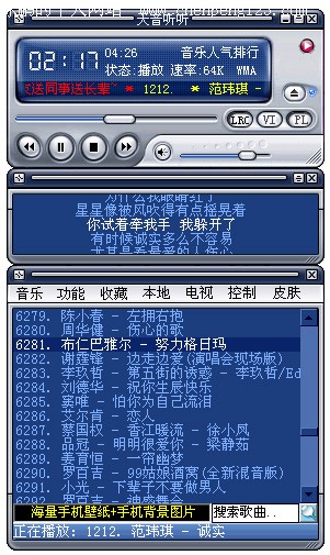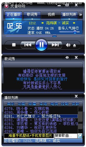 新版中最令大家期待的应该是皮肤组件了,这次主要的制作任务也都是花费在了皮肤组件上(感谢骐骥一跃十步兄的努力)。皮肤设计的比较灵活,兼容性上做了比较大的功夫,可以从Winamp或千千静听的皮肤经过改动即可直接适用于天音听听,非常欢迎热心网友能帮着一起制作更多更漂亮的皮肤。本次程序自带了三个皮肤,均由各皮肤作者提供,在此一并感谢诸位。
