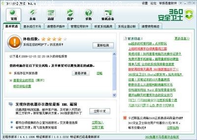 图05:360安全卫士 六、系统维护软件 在系统维护领域,由鲁锦开发的“Windows优化大师”自2000年1月1日发布以来就倍受用户好评,主要是它操作相当简单,没有过多下级菜单;而“超级兔子”功能虽然强大,却始终没有前者“红火”,屈居第二。今年由于Windows Vista系统的流行,使得“Vista优化大师”也受到不少用户关注。