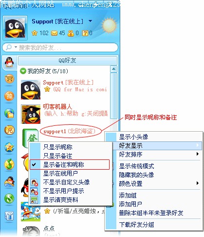 同时显示备注和昵称,好友备注昵称两不忘 QQ2008II Beta1新增加了在大头像模式下可以同时显示备注和昵称,这样子就可以把备注和昵称对应到同一个人,方便又实用。 给好友改了备注,事后却发现忘了好友的昵称,结果常常不能把备注和昵称对应到同一个人,真尴尬。从现在开始就结束这尴尬吧,只要您使用QQ2008II Beta1,并且选择了大头像模式,那么您就可以选择备注名和昵称同时显示了。