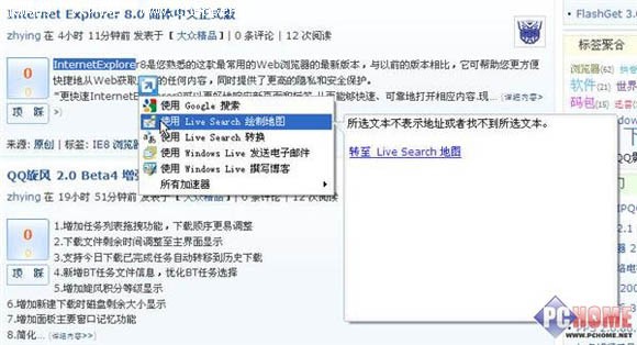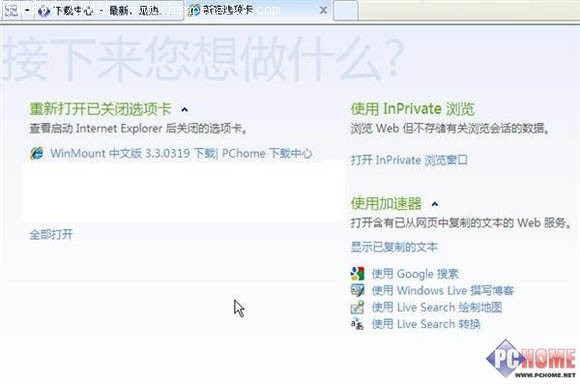 IE8功能有余速度糟糕 Internet Explorer 8 经过1年的测试,终于在北京时间3月20日凌晨发布。整体来说,IE8 各项功能非常不错,一起来快速领略一下吧! 标签:新建空白标签吸能了一些推荐内容以及服务(图1),如:重新打开关闭的标签页,对复制文本进行后期系列操作(谷歌搜索、添加到Blog等等)。同时,标签的显示方式也有所改变,同一个网站的标签都会以相同的颜色显示,此外可通过快速导航选项卡来查看当前所有标签的页的缩略图,或是通过文字列表方式显示。