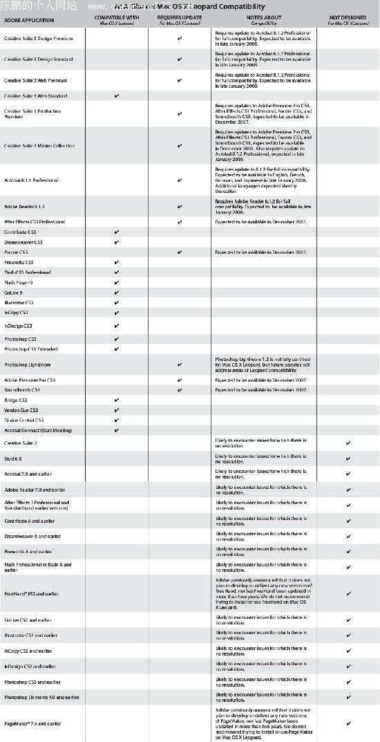 作为苹果最重要的第三方软件合作伙伴之一,Adobe宣布其大部分新版软件都兼容Leopard Mac OS X 10.5,但有一些需要安装升级补丁。 Adobe称,Photoshop CS3、Flash CS3 Professional、Contribute CS3、Dreamweaver CS3、Fireworks CS3、Flash Player 9、GoLive 9、Illustrator CS3、InCopy CS3、InDesign CS3、Bridge CS3、Version Cue CS3、Device Central CS3、Acrobat Connect (Start Meeting)等都完全兼容Leopard。 Acrobat 8 Professional的兼容性补丁会在2008年1月推出,而Premiere Pro CS3、After Effects CS3 Professional、Encore CS3、Soundbooth CS3等影音编辑工具也会在今年12月得到自己的兼容升级补丁。 除了上边提到的产品,旧版Adobe和Macromedia软件都没有Leopard兼容性保证,可能会碰到“安装、稳定性和可靠性方面的问题,但不会有解决方案”,Adobe不会提供升级。 点击下载Adobe官方说明文档(PDF) 点击放大: