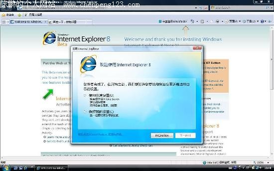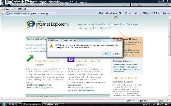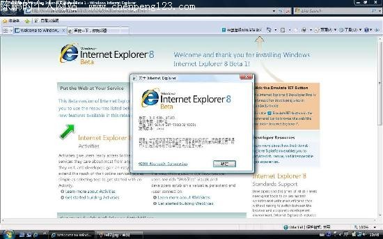 昨天cnBeta报道了IE8测试版已经开始邀请的消息,今天就迅速出现了IE8 Beta1的更多截图,并且是简体中文版的!据消息称,微软内部网络已经可以下载到,并且包含中文版(见截图)。官方相关页面已经推出(见下),但是其中的下载链接普通用户无法下载。 除了之前报道的“收藏夹”工具栏的改变,在Beta1中还出现了一个“模拟IE7”的按钮,可以让IE8运行在IE7模式下,避免了采用Web标准之后对IE6/7网站的不兼容。