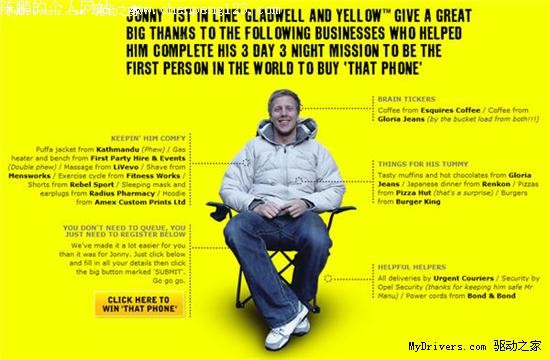 上周末,全世界的目光都聚集在了一个新西兰小伙子身上,这位名叫Jonny Gladwell的大学生排了三天三夜的队,终于成为全球首位买到iPhone 3G的幸运儿。但最新消息显示,整个排队到购买到全球知名的过程都是一个预先安排好的广告“阴谋”。 新西兰黄页集团日前宣布,Jonny Gladwell是在他们的雇用下去提前三天排队的,目的就是宣传奥克兰黄页电话号码簿的神奇功用。因为,他这三天的全套装备以及衣食住行都是依靠从黄页中找到的当地赞助商。他的服装有人赞助,食品有人赞助,咖啡有两家赞助商,其他赞助内容还包括燃气炉、按摩、健身、睡觉用的眼罩、户外电源、所有赞助产品的运输等等。甚至,他在这三天中还有一家保全公司提供的保镖专职护卫。 这下大家明白了吧,你被耍了。不过不要生气,现在可以补偿大家。黄页公司在揭开谜底的同时,也宣布将送出Jonny Gladwell买到的那台全球第一iPhone 3G,网友只要在该公司网站上注册就有机会赢得这次抽奖。当然,仅针对新西兰当地用户。