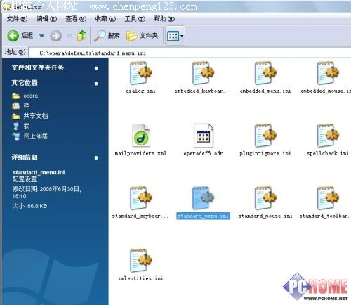 首先,让我们打开C盘的 Program Files\Opera\defaults目录,找到standard_menu.ini,大家可以做一下备份以免出现意外。然后选择standard_menu.ini文件。
