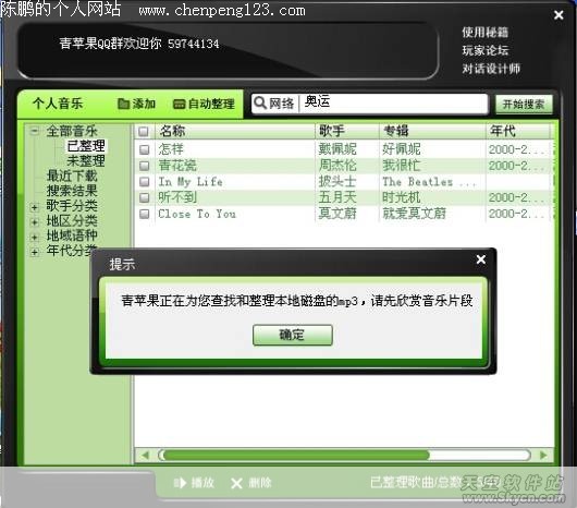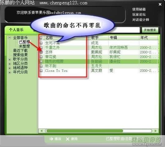 整理第一步 女友平时上网,总喜欢有意无意的往电脑硬盘里塞几首自己喜欢的歌曲。但是时间一长,不仅整个硬盘的各个驱动器、各个文件夹都散布着数量众多的歌曲文件,而且像1.mp3、2.mp3、aaa.mp3等这样命名方式的歌曲,如果不一一打开,则根本不知道与之对应的究竟是什么歌曲。有时候笔者一冲动就想通通删除这些零乱不堪的歌曲,腾出本来就非常有限的硬盘空间,不过这样女友肯定会与笔者拼命;如果不删除它们,这些命名莫名其妙的歌曲文件、存放位置乱七八糟的歌曲文件以及可能夹杂着重复曲目的歌曲文件,似乎更加让人头疼。 近日,笔者无意中找到了一款叫做“青苹果音乐播放器”的免费小软件,它不仅音乐播放功能非常出色、音质效果出众,而且其智能化的歌曲管理功能更是在区区几分钟之内,就完成了笔者硬盘中散落着的几百首歌曲文件的快速和智能整理,的确让笔者和女友对这款软件刮目相看。接下来笔者就把该软件的歌曲智能管理功能向大家进行一番展示。 青苹果音乐播放器下载地址:http://download.enet.com.cn/speed/toftp.php?fname=050412008081101 整理第一步:自动全盘搜索歌曲 “青苹果音乐播放器”本身不含有任何第三方插件,用户双击下载下来的安装文件并一路单击“下一步”按钮即可瞬间完成软件安装。 用户第一次启动软件时,软件会自动抢先对用户硬盘中已经存放的所有歌曲文件进行扫描,然后默认以列表方式向用户反馈当前硬盘中已经扫描到的所有歌曲,通常这个过程根据不同硬盘的容量大小只需要区区十几秒到几十秒钟,非常快速(如图1)。
