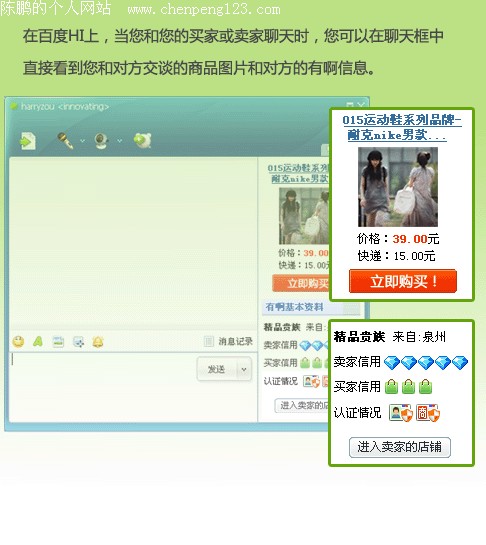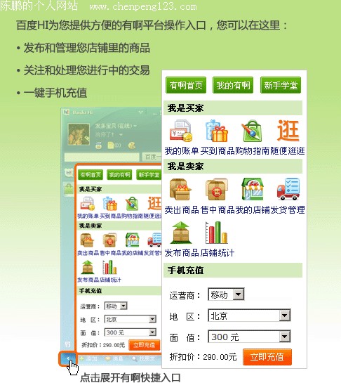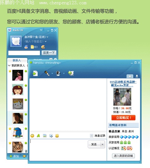 百度有啊定制版的百度Hi在界面上没多大变化,主要增加了百度有啊的相关图标,比如个人资料显示、左侧标签栏、消息提醒。最大的变化是在功能方面,与百度有啊平台的在线功能充分结合,左侧的百度有啊快捷入口可以方便的管理自己的买卖流程、买卖商品会有专门的消息提醒、个人资料界面可以展示商品与信用等资料,这些功能与QQ、旺旺等的功能类似。