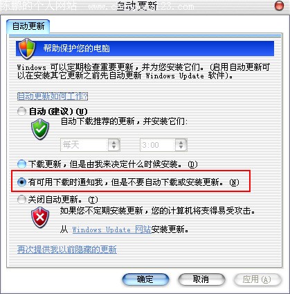 规避XP正版验证 黑屏离我远去 今日头条 微软WGA 请谨慎使用“自动更新” 最大的新闻就是微软要启动Windows XP专业版及Office的正版验证计划(简称“WGA”)。安装了盗版Windows XP专业版的电脑将被强行每小时“黑屏”(桌面背景变为纯黑色)一次,Office的菜单栏将被添加“不是正版”的标记。 那么我们除了应用正版验证外,还是不要没有目的的update。 如果你不想被WGA和OGA打扰,你可以: 1. 关闭自动更新。 2. 将自动更新方式改为“有可用下载时通知我,但是不要自动下载或安装更新。”,有更新提示后自己手工选择补丁下载。 推荐采用第二种方法,这样不会错过其他的重要更新。