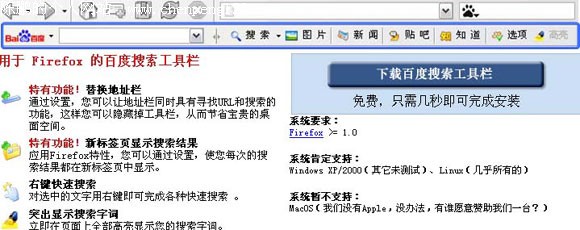 近日记者发现网友之间热传一款新开发的基于firefox的百度超级搜霸工具条(见图)。据记者所知,百度尚未开发firefox环境下使用的搜索工具条。点开百度超级搜霸的官方产品介绍页面bar.baidu.com可以看到,百度超级搜霸目前只支持IE浏览器下使用。