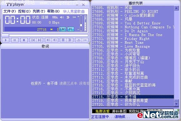 天音听听,不可不听!自从我们在11月3日发布了全新的2.0版本后,受到了用户空前的欢迎。而这次,我们再次应用户的强烈要求,专门开通了网通用户专线。从此再也不受中国网络南北不通的限制,真正的想听就听! 用户网络选择方法:在“文件”菜单中点击“网络环境设置”,然后在弹出的窗口中选择“中国网通(北方)”,然后再确定即可。 目前只有天音听听2.0以上版本才可以使用网通通道。鉴于还有部分用户停留在2.0以下的版本,为了让所有用户都能使用网通服务器,我们需要对原有音乐数据进行服务器间的调整,数据正在传送中,2.0以下版本的网通用户也将在近日可以享受到网通线路的高速服务,敬请期待。