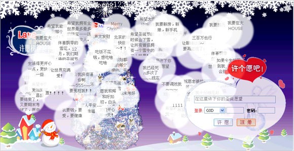 每年的12月25日是西方国家的传统节日圣诞节,但不知从何时起,这个节日同样受到时髦的中国人的追捧。2006年的圣诞节即将到来,笔者发现很多网站都推出了自己的圣诞节专题,还有一系列的中奖活动,诱惑着网友去参加。笔者在网上随意的浏览,发现了这个网站还不错。大家可以进去看一下: 地址:http://www.lava-lava.com/_christmas.php。 这个名为“愿望就要大声说出来”的活动,可以用即时通讯来许愿,当你的心愿被好友顶/拍越多,梦想成真的指数将会更高。在参加该圣诞许愿的活动中,你不仅极有可能被抽中成为幸运儿,获得bobo和toto的玩偶、圣诞围巾、挂历等,倘若你对你的许愿非常有信心,你还可以将你的许愿推荐给你的好友们,让他们一起帮你将你的愿望顶到最高点,你就能获得苹果新款IPOD的圣诞礼物了。当然,好东西要和好朋友一起分享,你应该推荐你的好友和你一起来玩这个游戏,每日惊喜都在等着你们。