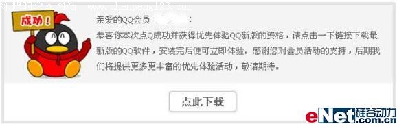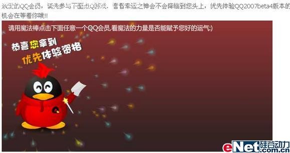 活动规则 1、该活动面向所有QQ会员用户,活动时间2007年7月24日-7月26日。 2、活动期间共发送22万体验资格,分3天发送,7月24日发送2万名额,7月25号与7月26号每天各发放10万名额。每天中午12点开始发放。一个QQ会员号码只能参与一次“点Q”活动,并按照一定的概率获得该体验资格,“点Q”结果立即公布! 3、所有获得抢先体验资格的用户,将得到下载最新QQ版本的链接,下载完软件后可用您报名资料所填写的QQ号码进行登录体验,并可反馈体验后的各种意见。 4、本次体验版的QQ仅支持获得体验资格的QQ帐号的登录,其他号码将不能进行登录。 5、腾讯客服务电话0755-83765566,本活动解释权归腾讯公司所有。 首先大家要参加一个类似“砸金蛋”的活动,运气好就可以参加测试了哦。