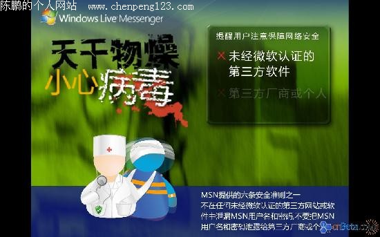 为了提高安全上网意识,抵制病毒,MSN 推出了一款安全专题屏保,供用户下载使用。想了解可爱的Messenger Buddy 医生和病人是如何全力合作抵抗病毒的。 首先,不在任何未经微软认证的第三方网站或软件中泄漏MSN用户名和密码,不要把MSN用户名和密码泄露给第三方厂商或个人。 其次,不在第三方网站登录网页版MSN,防止用户名和密码被记录和盗用; 第三,定期登录MSN官方认证站点,更改个人MSN密码,防止账户信息被盗用; 第四,谨慎使用未经微软认证的MSN插件,防止用户名和密码被盗用; 第五,确保在MSN设置中,开启自动进行文件传输病毒扫描选项,及时更新病毒库,并访问MSN官方网站获取最新的安全提示; 第六,不接收来历不明或可疑的文件和链接。 官方信息:http://im.live.cn/production/01.htm 下载:Windows Live Messenger 安全专题屏保